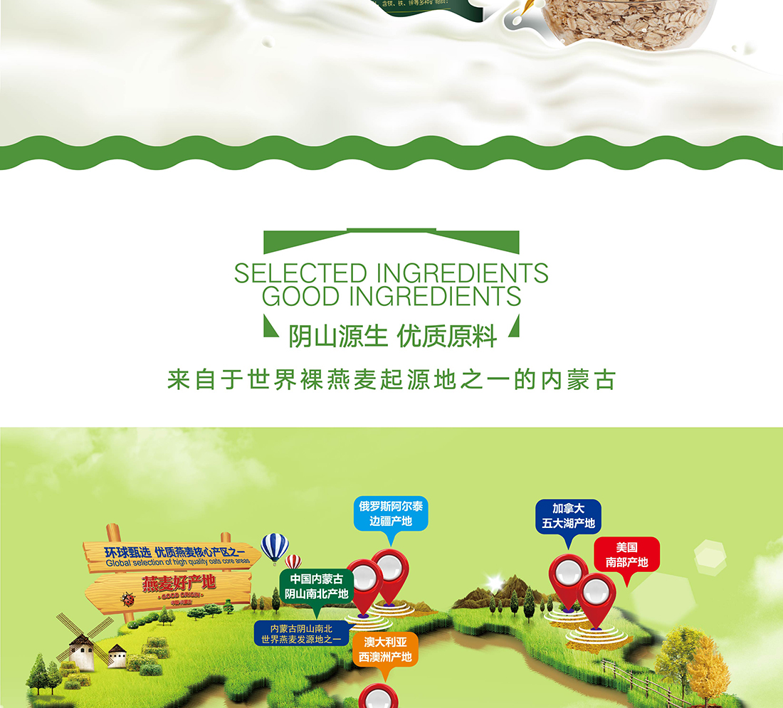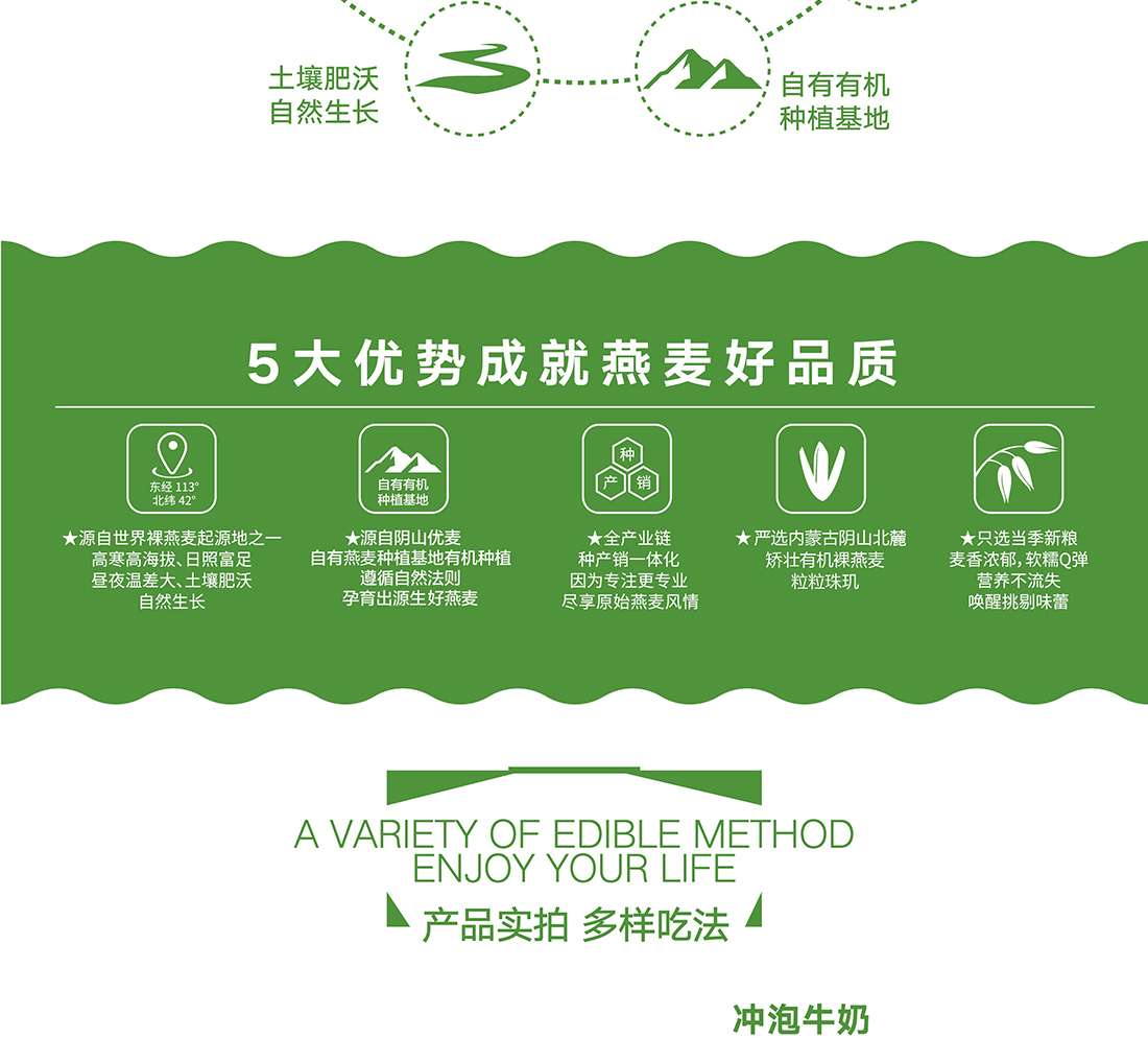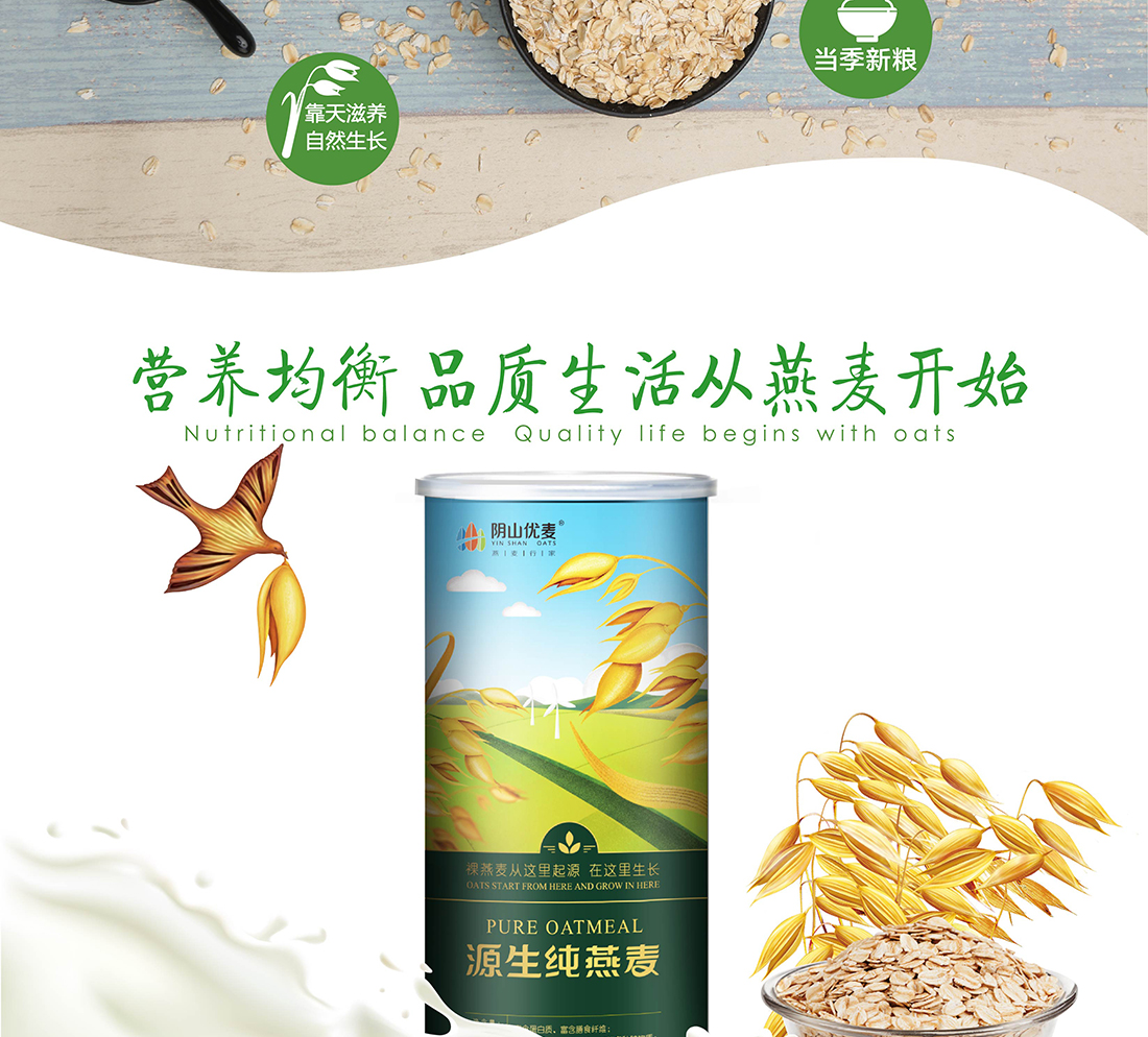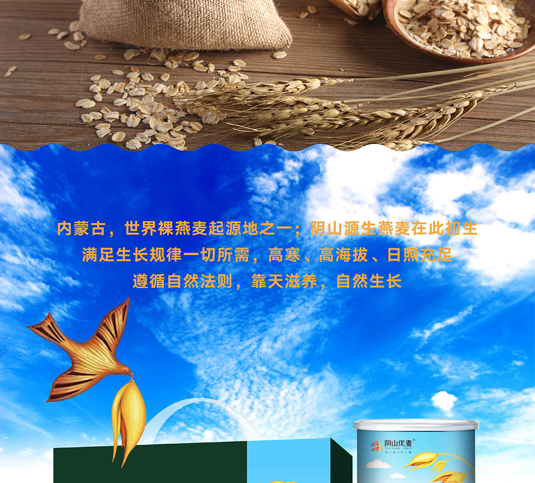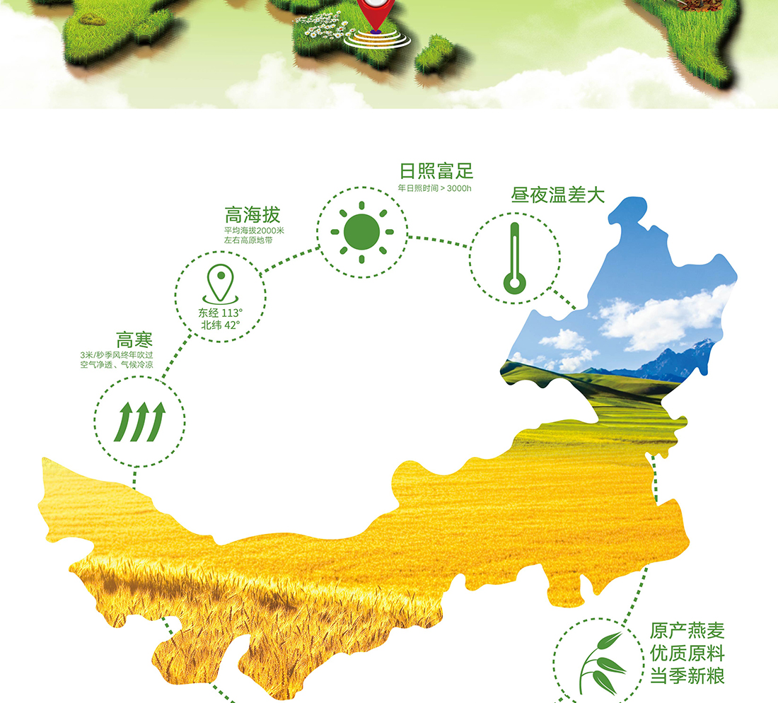 內蒙古,世界裸燕麥起源地之一;陰山源生燕麥在此初生滿足生長規(guī)律一切所需,高寒、高海拔、日照充足;遵循自然法則,靠天滋養(yǎng),自然生長