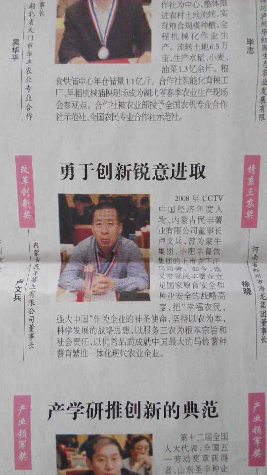 日前,全國(guó)“北大荒”杯2013年度“中國(guó)農(nóng)村新聞人物”評(píng)選活動(dòng)揭曉,內(nèi)蒙古民豐薯業(yè)有限公司董事長(zhǎng)盧文兵光榮當(dāng)選,獲“改革創(chuàng)新獎(jiǎng)”。